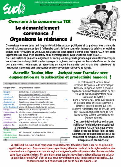 Vous trouverez ci-joint le dernier tract de la Fédération SUD-Rail concernant le nouveau découpage et le calendrier des lots Transilien en Île-de-France, soumis au vote du CA d’Île-de-France Mobilités le 17 octobre 2025.