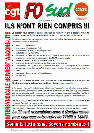 Depuis toujours, les ADC des trains INTERCITÉS font figure de parents pauvres par rapport aux autres activités. Pourtant, la technicité requise, le travail de nuit et les conditions de travail dégradées à cause de la vétusté du matériel du parc ordinaire devrait se traduire par une juste (…)