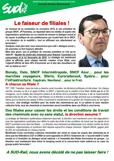 l’éclatement du groupe SNCF pour faciliter les filialisations/privatisations/externalisations de cet outil de transport public. L’autonomie complète des Sociétés d’Anonymes atomise nos collectifs (…)