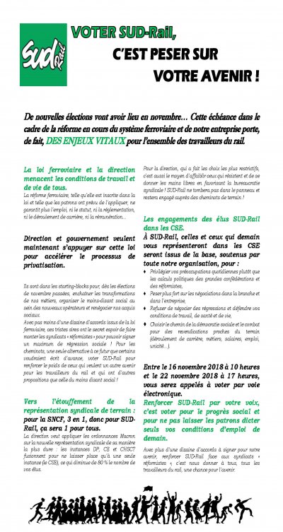 De nouvelles élections vont avoir lieu en novembre… Cette échéance dans le cadre de la réforme en cours du système ferroviaire et de notre entreprise porte, de fait, DES ENJEUX VITAUX pour l’ensemble des travailleurs du rail.