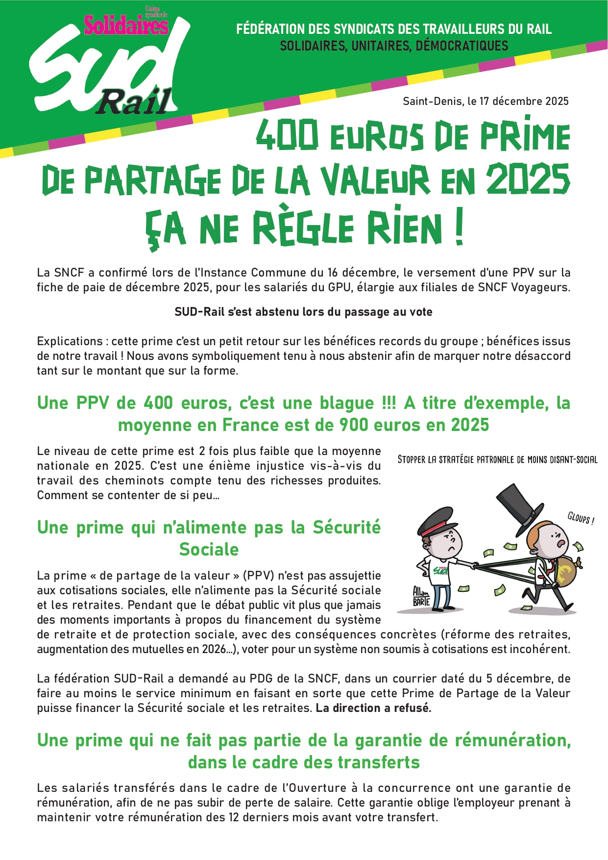 Explications : cette prime c’est un petit retour sur les bénéfices records du groupe ; bénéfices issus de notre travail ! Nous avons symboliquement tenu à nous abstenir afin de marquer notre désaccord tant sur le montant que sur la forme.
