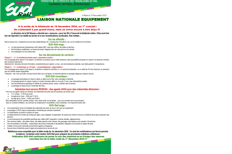 La direction de la SA Réseau a dévoilé ses « mesures » pour les SE à l’issue de la bilatérale métier. Elles sont très loin de répondre à la réalité du terrain et à nos revendications syndicales. Des miettes…