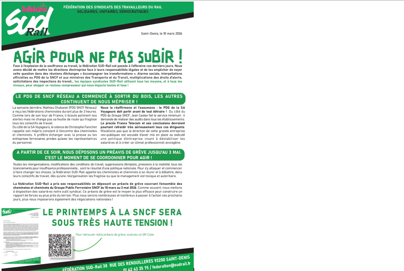 officielles au PDG de la SNCF et aux ministres des Transports et du Travail, multiplications des droits d’alerte, sollicitations des inspections du travail… les équipes syndicales SUD-Rail utilisent tous les moyens, et à tous les niveaux, pour stopper ce rouleau compresseur qui nous impacte toutes et tous !
