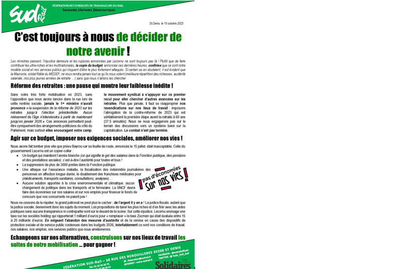 Les ministres passent, l’injustice demeure et les ruptures annoncées par Lecornu ne sont toujours pas là ! Plutôt que de faire contribuer les ultra-riches et les multinationales, la copie du budget, annoncée ces dernières heures, confirme que ce sont notre modèle social et nos services publics qui risquent d’être le plus fortement attaqués. Si certain·es en doutaient, il est évident que la Macronie, soldat fidèle du MEDEF, ne nous rendra jamais tout ce qu’ils nous volent (meilleure répartition des richesses, austérité salariale, nos plus jeunes années de retraite …) sans que nous n’allions les chercher.
