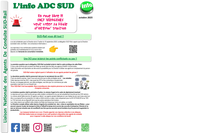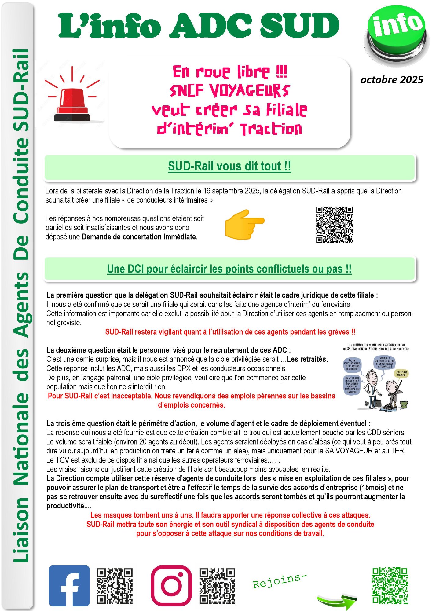 Lors de la bilatérale avec la Direction de la Traction le 16 septembre 2025, la délégation SUD-Rail a appris que la Direction souhaitait créer une filiale « de conducteurs intérimaires ».