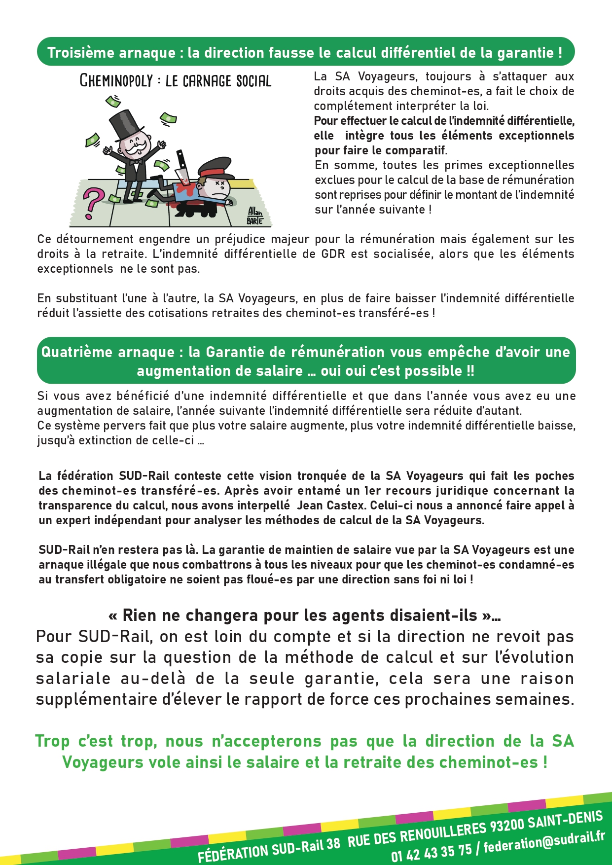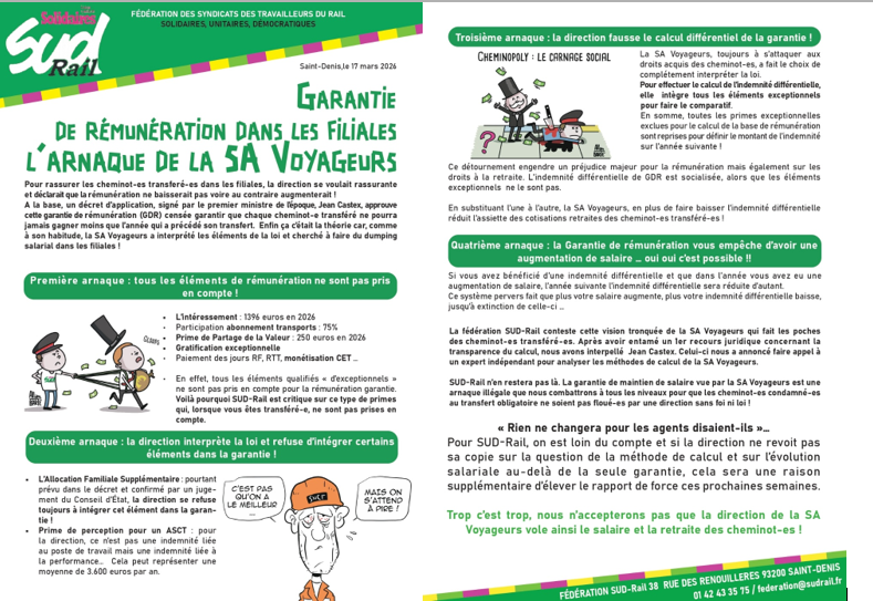 A la base, un décret d’application, signé par le premier ministre de l’époque, Jean Castex, approuve cette garantie de rémunération (GDR) censée garantir que chaque cheminot-e transféré ne pourra jamais gagner moins que l’année qui a précédé son transfert. Enfin ça c’était la théorie car, comme à son habitude, la SA Voyageurs a interprété les éléments de la loi et cherché à faire du dumping salarial dans les filiales !