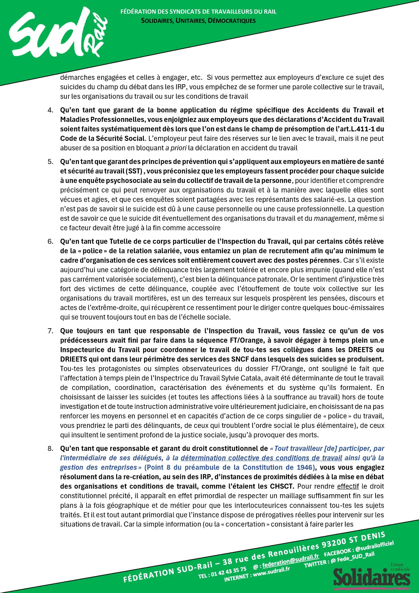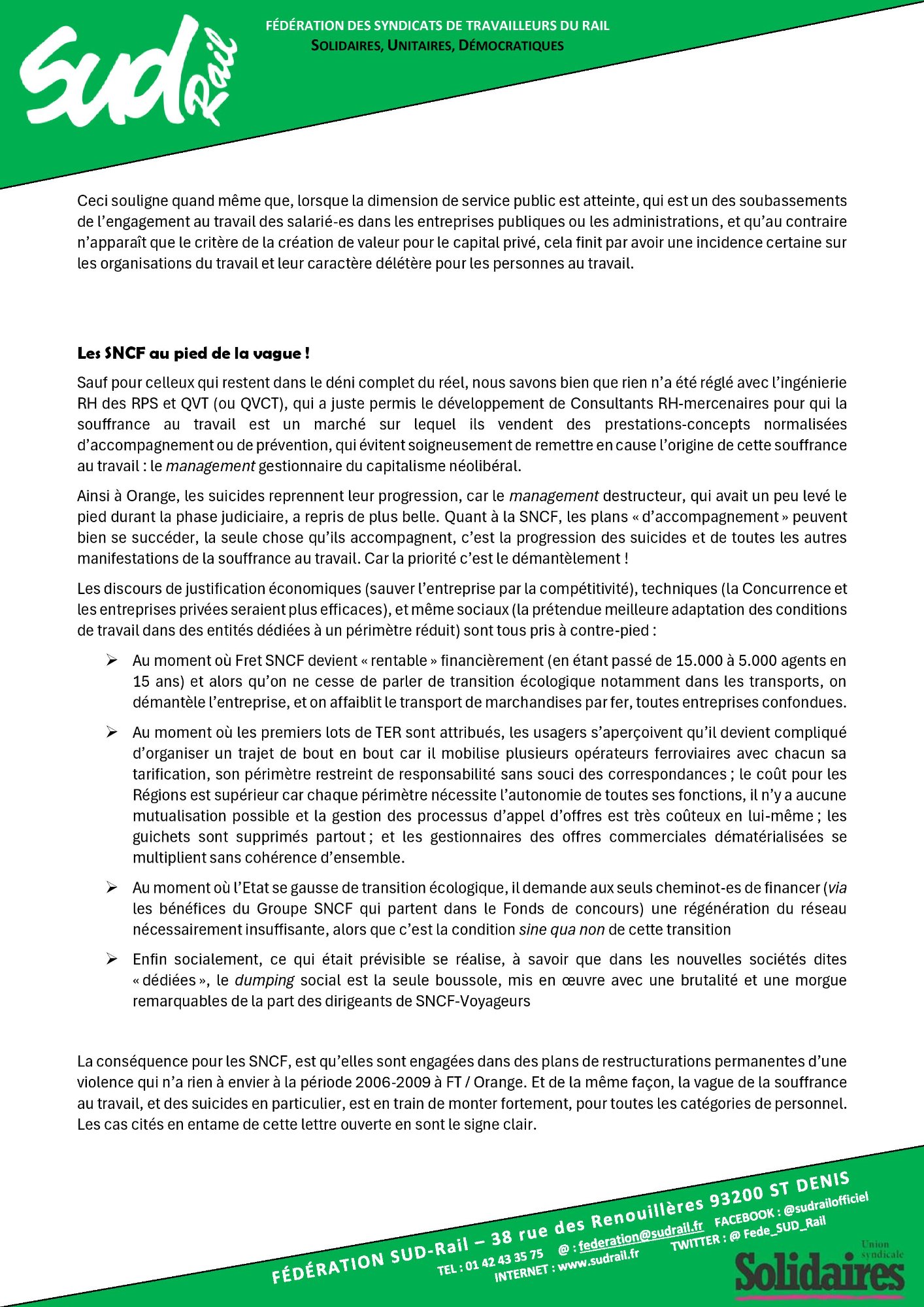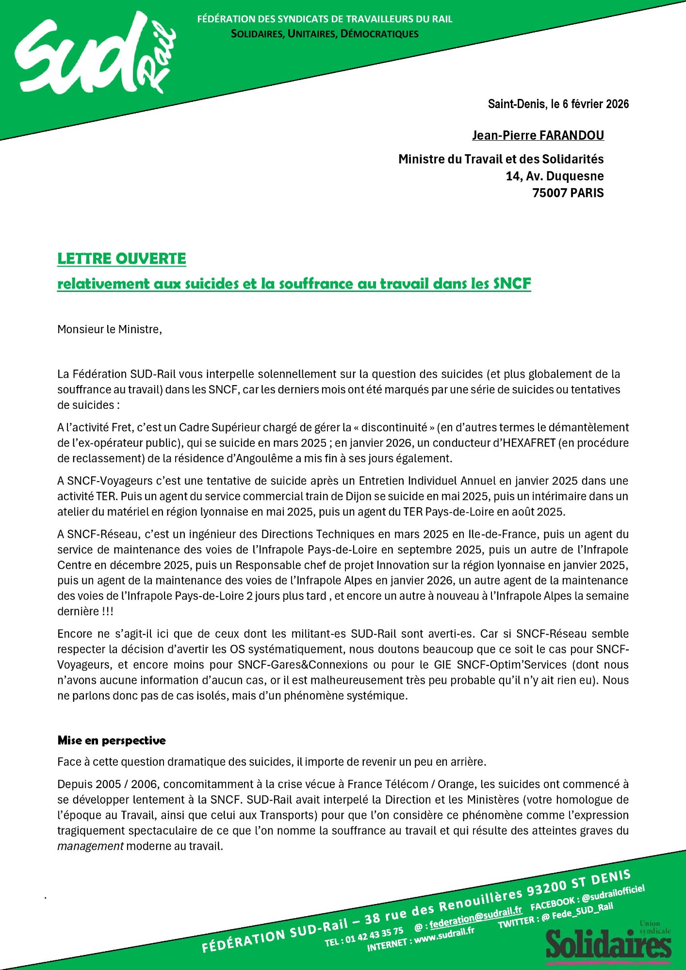 Retrouvez l’interpellation solennelle de la fédération SUD-Rail à JP Farandou, ministre du Travail, ex PDG SNCF,sur la question des suicides à la SNCF