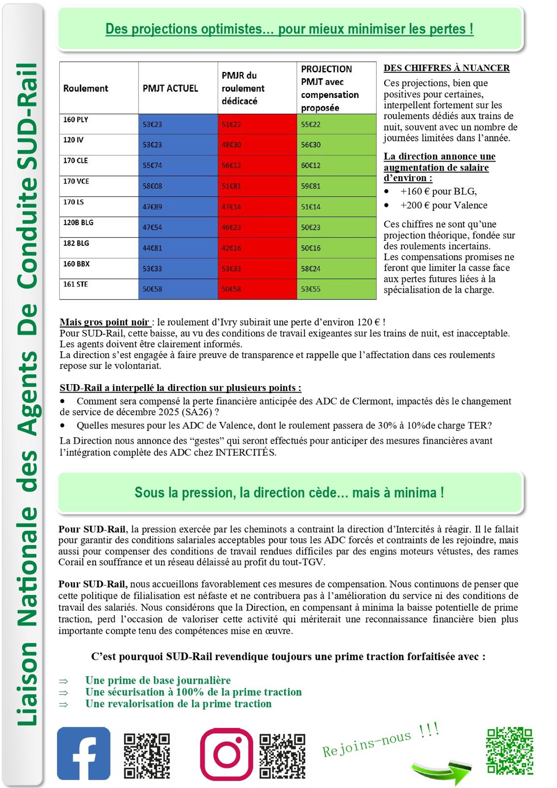 Depuis toujours, les ADC des trains INTERCITÉS font figure de parents pauvres par rapport aux autres activités. Pourtant, la technicité requise, le travail de nuit et les conditions de travail dégradées à cause de la vétusté du matériel du parc ordinaire devrait se traduire par une juste reconnaissance financière. Aujourd’hui, les roulements sont généralement multi activités, ce qui permet un équilibre financier en maintenant des primes traction correctes.