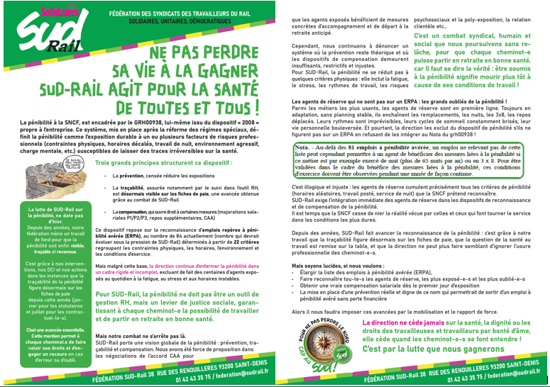La pénibilité à la SNCF, est encadrée par le GRH00938, lui-même issu du dispositif « 2008 » propre à l’entreprise. Ce système, mis en place après la réforme des régimes spéciaux, définit la pénibilité comme l’exposition durable à un ou plusieurs facteurs de risques professionnels (contraintes physiques, horaires décalés, travail de nuit, environnement agressif, charge mentale, etc.) susceptibles de laisser des traces irréversibles sur la santé.