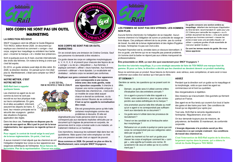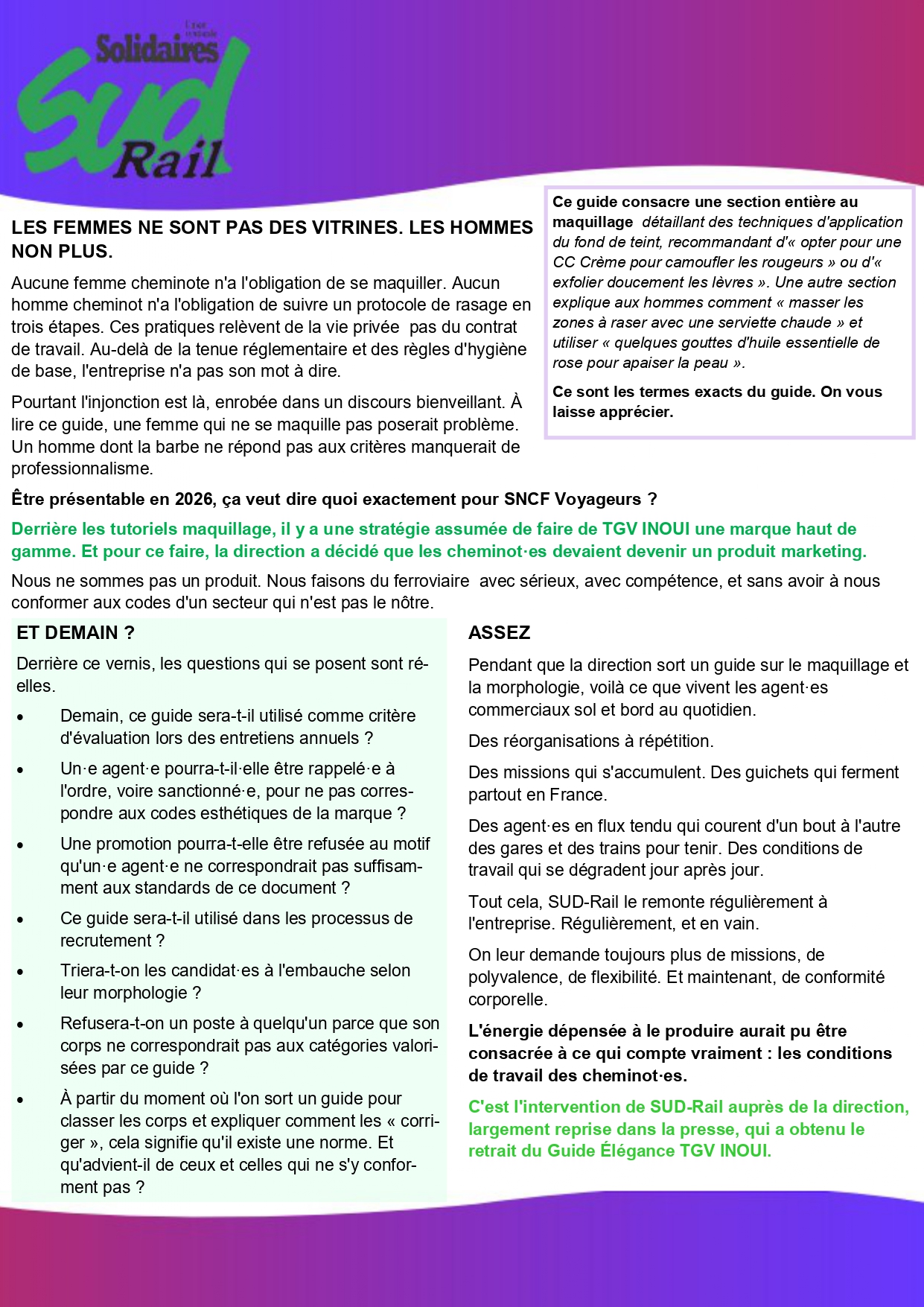 C’est l’intervention de SUD-Rail auprès de la direction, largement reprise dans la presse, qui a obtenu le retrait du Guide Élégance TGV INOUI.