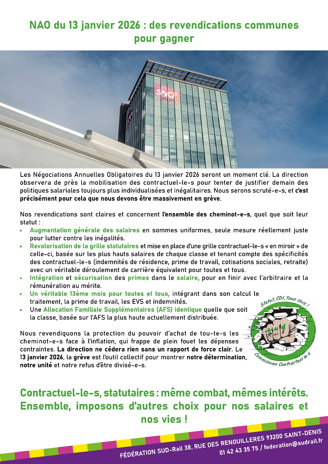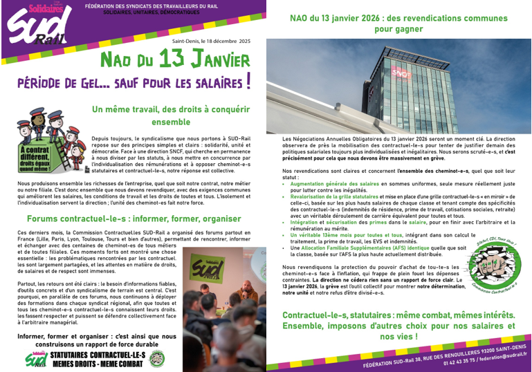 Nous produisons ensemble les richesses de l’entreprise, quel que soit notre contrat, notre métier ou notre filiale. C’est donc ensemble que nous devons revendiquer, avec des exigences communes qui améliorent les salaires, les conditions de travail et les droits de toutes et tous. L’isolement et l’individualisation servent la direction ; l’unité des cheminot-es fait notre force.