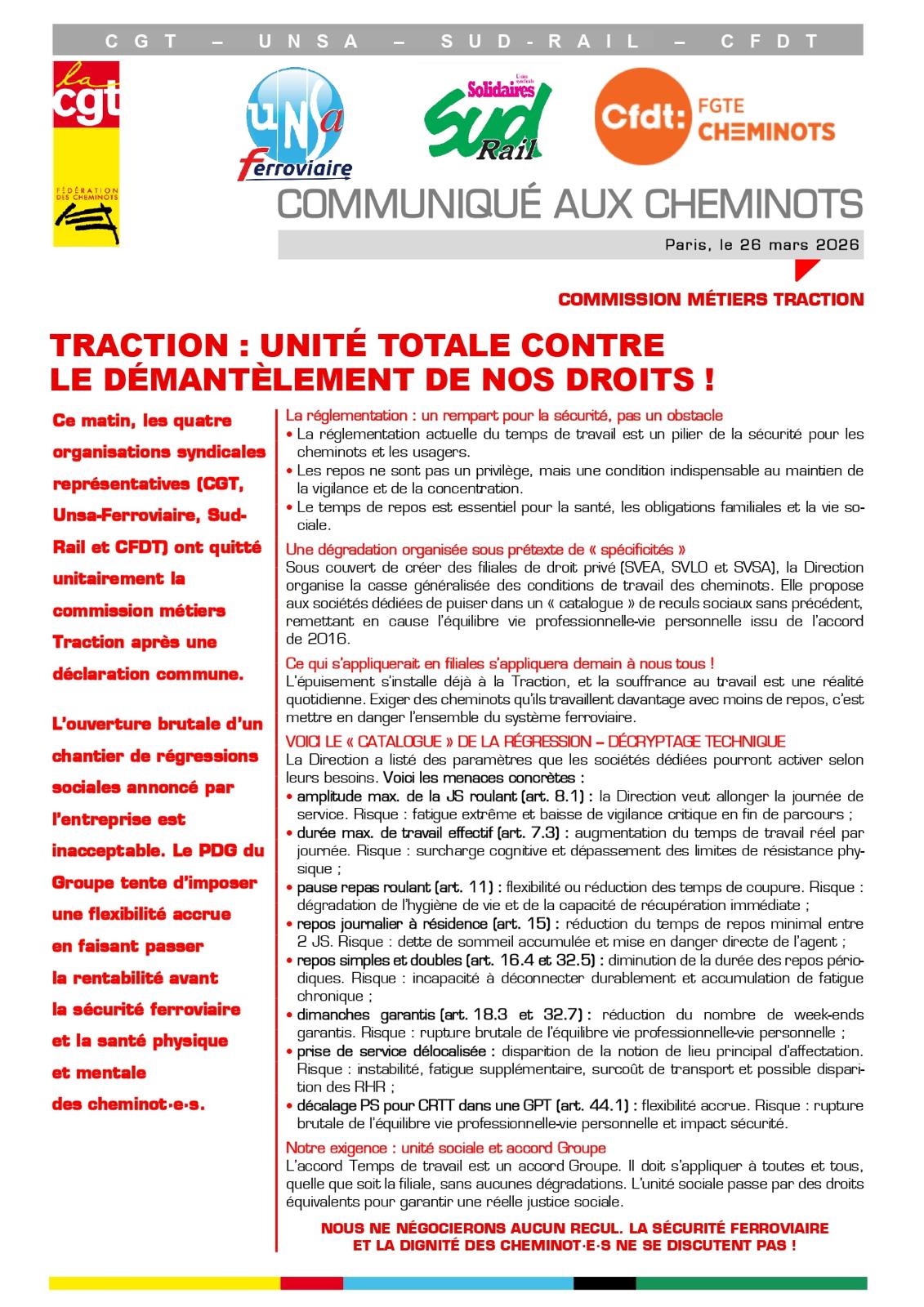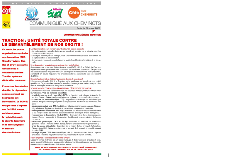 Ce matin, les quatre organisations syndicales représentatives (CGT, Unsa-Ferroviaire, Sud-Rail et CFDT) ont quitté unitairement la commission métiers Traction après une déclaration commune.
