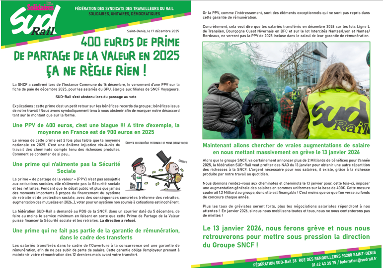 La SNCF a confirmé lors de l’Instance Commune du 16 décembre, le versement d’une PPV sur la fiche de paie de décembre 2025, pour les salariés du GPU, élargie aux filiales de SNCF Voyageurs.