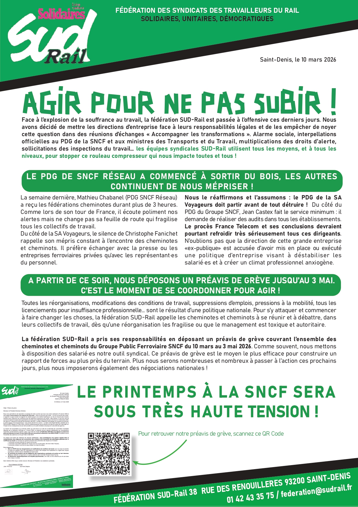 officielles au PDG de la SNCF et aux ministres des Transports et du Travail, multiplications des droits d’alerte, sollicitations des inspections du travail… les équipes syndicales SUD-Rail utilisent tous les moyens, et à tous les niveaux, pour stopper ce rouleau compresseur qui nous impacte toutes et tous !