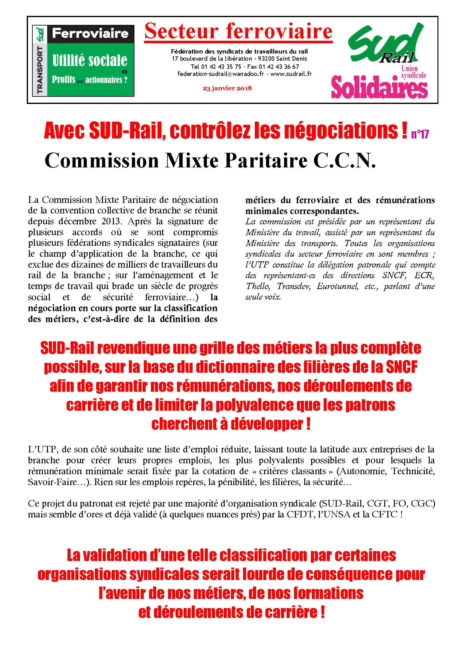 La Commission Mixte Paritaire de négociation de la convention collective de branche se réunit depuis décembre 2013. Après la signature de plusieurs accords où se sont compromis plusieurs fédérations syndicales signataires (sur le champ d’application de la branche, ce qui exclue des dizaines de milliers de travailleurs du rail de la branche ; sur l’aménagement et le temps de travail qui brade un siècle de progrès social et de sécurité ferroviaire…) la négociation en cours porte sur la classification des métiers, c’est-à-dire de la définition des métiers du ferroviaire et des rémunérations minimales correspondantes.