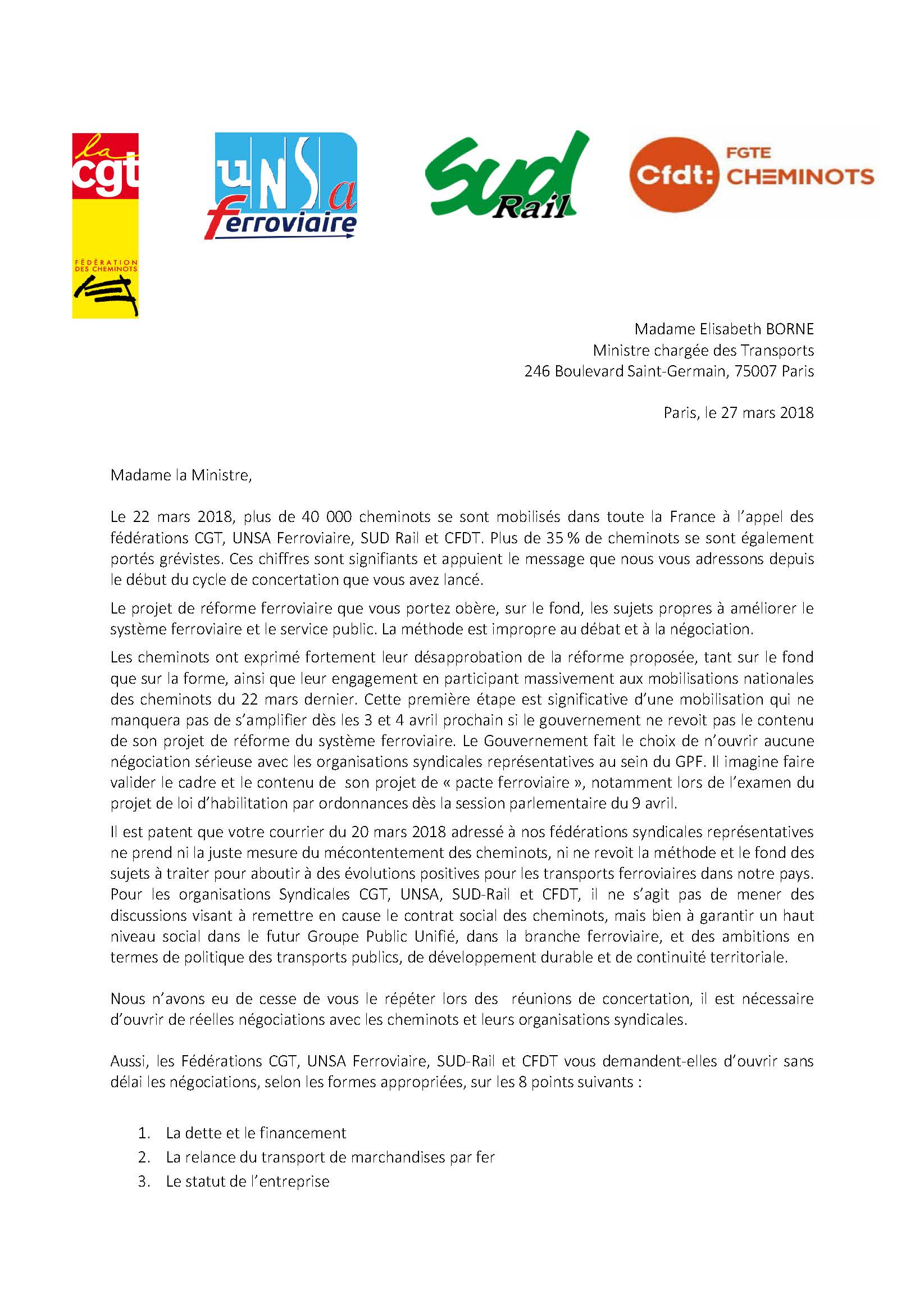Il est patent que votre courrier du 20 mars 2018 adressé à nos fédérations syndicales représentatives ne prend ni la juste mesure du mécontentement des cheminots, ni ne revoit la méthode et le fond des sujets à traiter pour aboutir à des évolutions positives pour les transports ferroviaires dans notre pays. Pour les organisations Syndicales CGT, UNSA, SUD-Rail et CFDT, il ne s’agit pas de mener des discussions visant à remettre en cause le contrat social des cheminots, mais bien à garantir un haut niveau social dans le futur Groupe Public Unifié, dans la branche ferroviaire, et des ambitions en termes de politique des transports publics, de développement durable et de continuité territoriale.