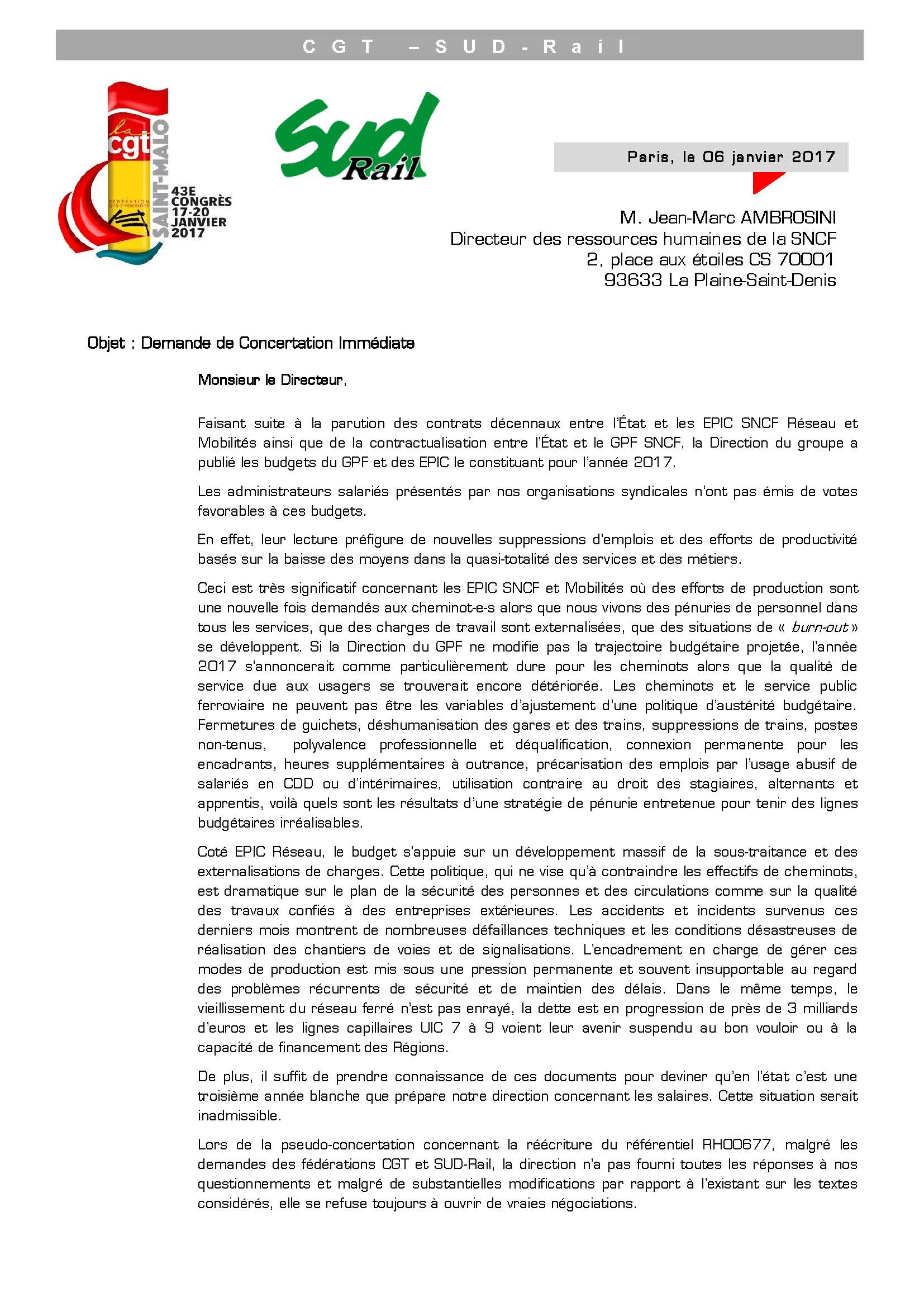 Ceci est très significatif concernant les EPIC SNCF et Mobilités où des efforts de production sont une nouvelle fois demandés aux cheminot-e-s alors que nous vivons des pénuries de personnel dans tous les services, que des charges de travail sont externalisées, que des situations de « burn-out » se développent. Si la Direction du GPF ne modifie pas la trajectoire budgétaire projetée, l’année 2017 s’annoncerait comme particulièrement dure pour les cheminots alors que la qualité de service due aux usagers se trouverait encore détériorée. Les cheminots et le service public ferroviaire ne peuvent pas être les variables d’ajustement d’une politique d’austérité budgétaire. Fermetures de guichets, déshumanisation des gares et des trains, suppressions de trains, postes non-tenus, polyvalence professionnelle et déqualification, connexion permanente pour les encadrants, heures supplémentaires à outrance, précarisation des emplois par l’usage abusif de salariés en CDD ou d’intérimaires, utilisation contraire au droit des stagiaires, alternants et apprentis, voilà quels sont les résultats d’une stratégie de pénurie entretenue pour tenir des lignes budgétaires irréalisables.