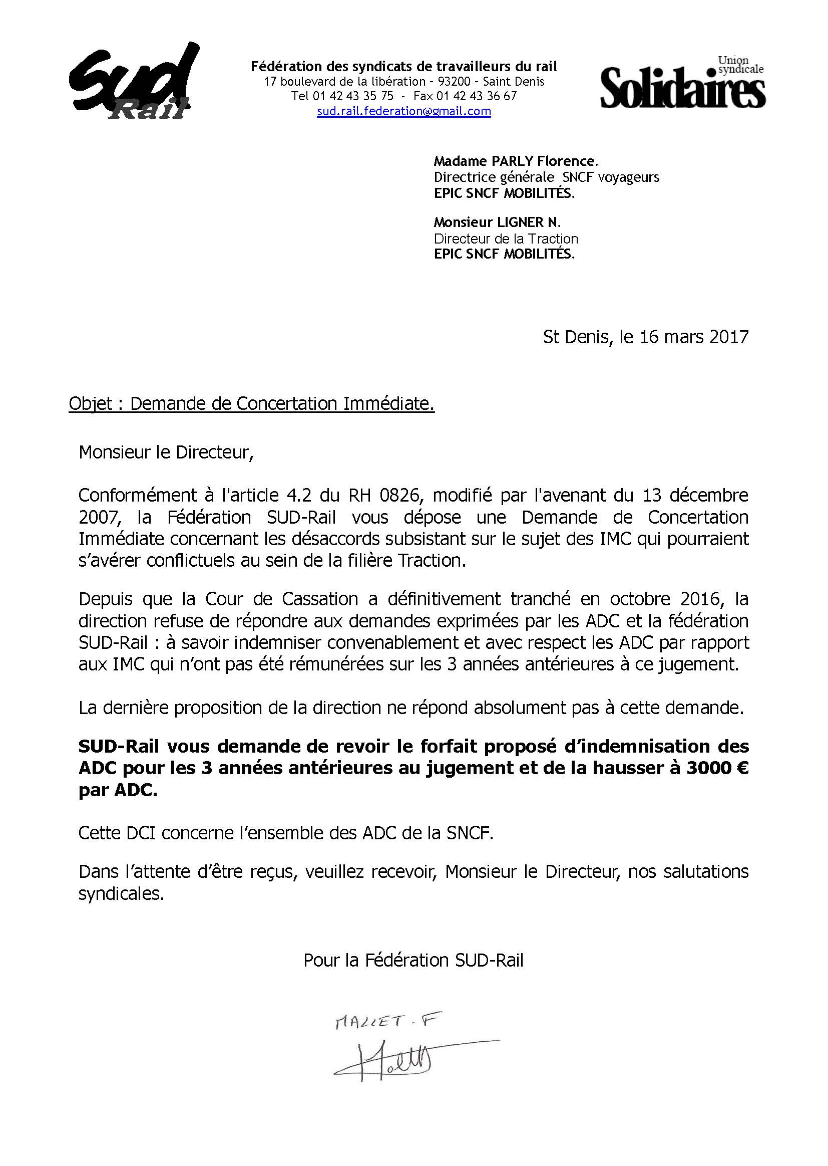 Conformément à l’article 4.2 du RH 0826, modifié par l’avenant du 13 décembre 2007, la Fédération SUD-Rail vous dépose une Demande de Concertation Immédiate concernant les désaccords subsistant sur le sujet des IMC qui pourraient s’avérer conflictuels au sein de la filière Traction.