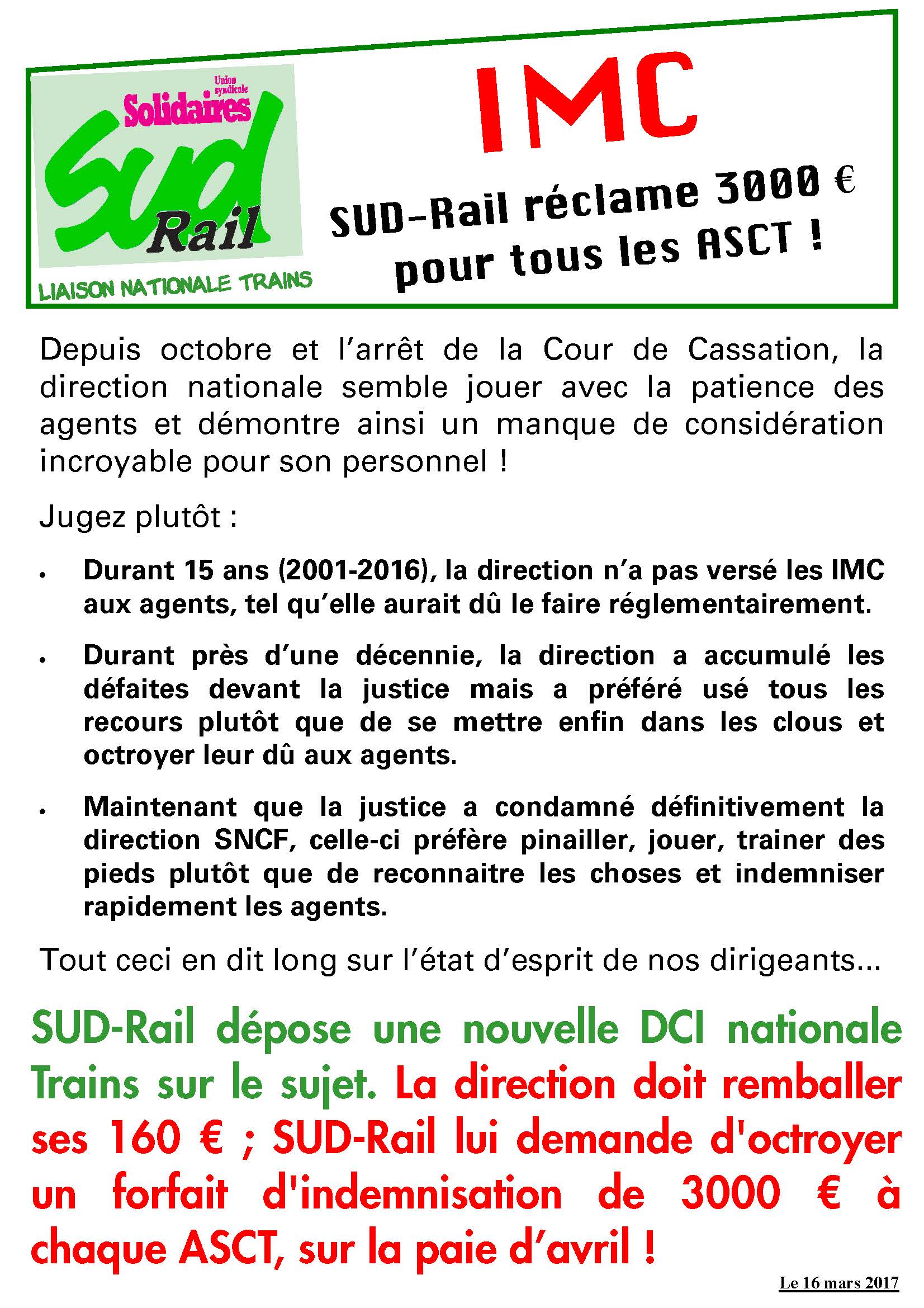 SUD-Rail dépose une nouvelle DCI nationale Trains sur le sujet. La direction doit remballer ses 160 € ; SUD-Rail lui demande d’octroyer un forfait d’indemnisation de 3000 € à chaque ASCT, sur la paie d’avril !