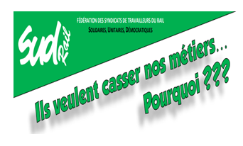 À SUD-Rail, nous revendiquons et nous sommes attachés à une entreprise publique unique et intégrée où chaque salarié dispose des mêmes droits, où chaque salarié puisse commencer sa carrière dans une filière et ensuite faire évoluer son déroulement professionnel tel qu’il le souhaite, peu importe son activité originelle !