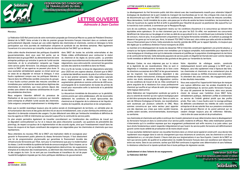 La Fédération SUD-Rail prend acte de votre nomination proposée par Emmanuel Macron au poste de Président-Directeur
