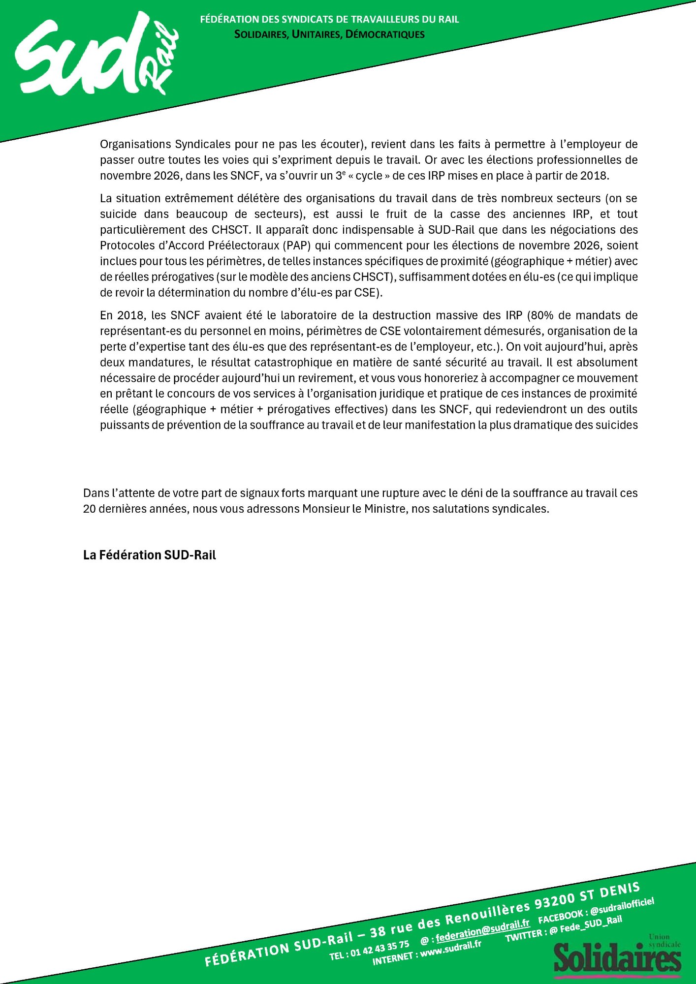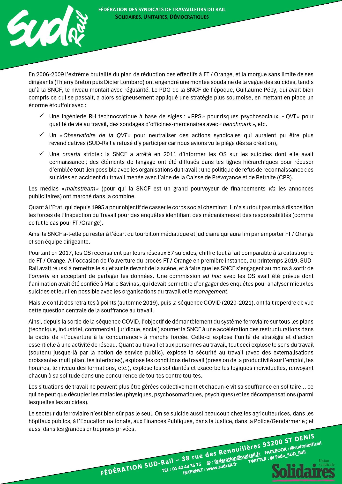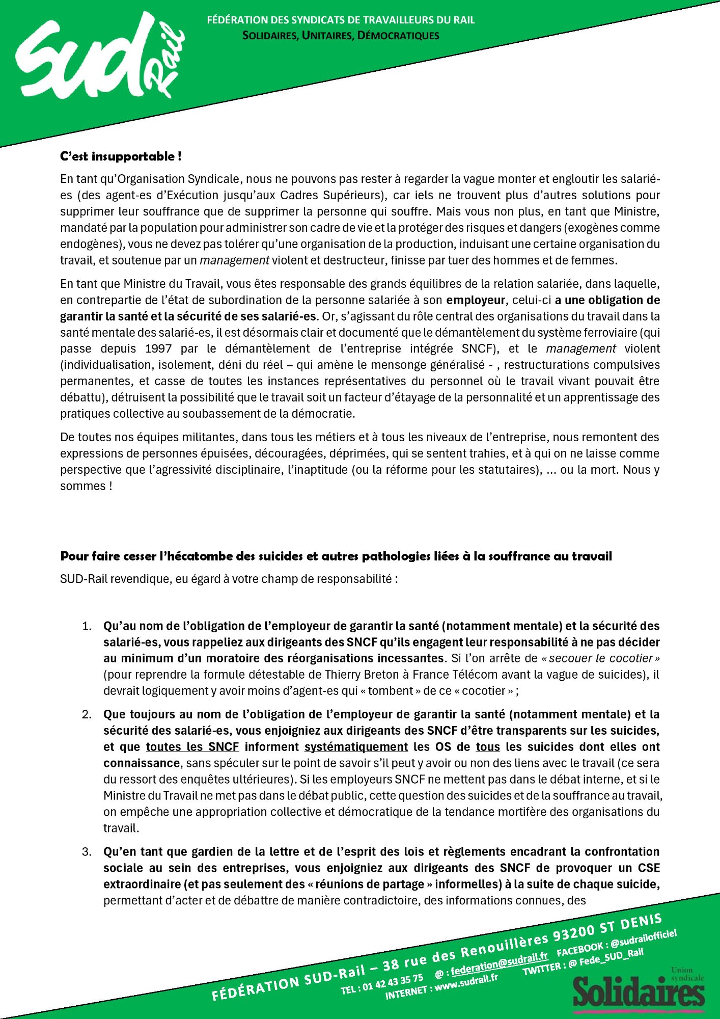 Retrouvez l’interpellation solennelle de la fédération SUD-Rail à JP Farandou, ministre du Travail, ex PDG SNCF,sur la question des suicides à la SNCF