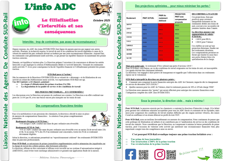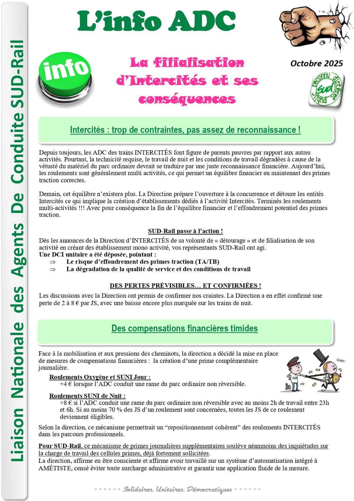 Depuis toujours, les ADC des trains INTERCITÉS font figure de parents pauvres par rapport aux autres activités. Pourtant, la technicité requise, le travail de nuit et les conditions de travail dégradées à cause de la vétusté du matériel du parc ordinaire devrait se traduire par une juste reconnaissance financière. Aujourd’hui, les roulements sont généralement multi activités, ce qui permet un équilibre financier en maintenant des primes traction correctes.