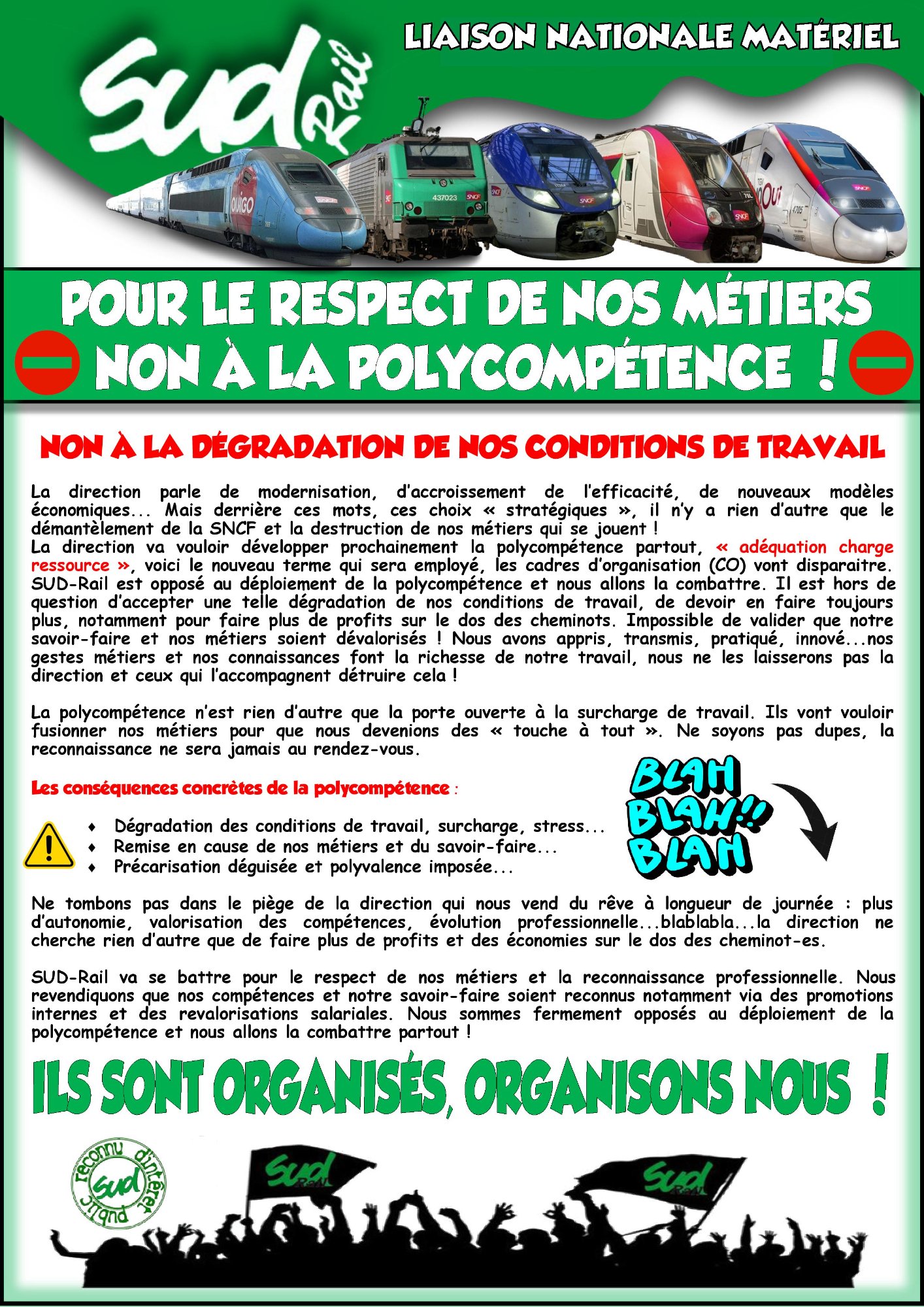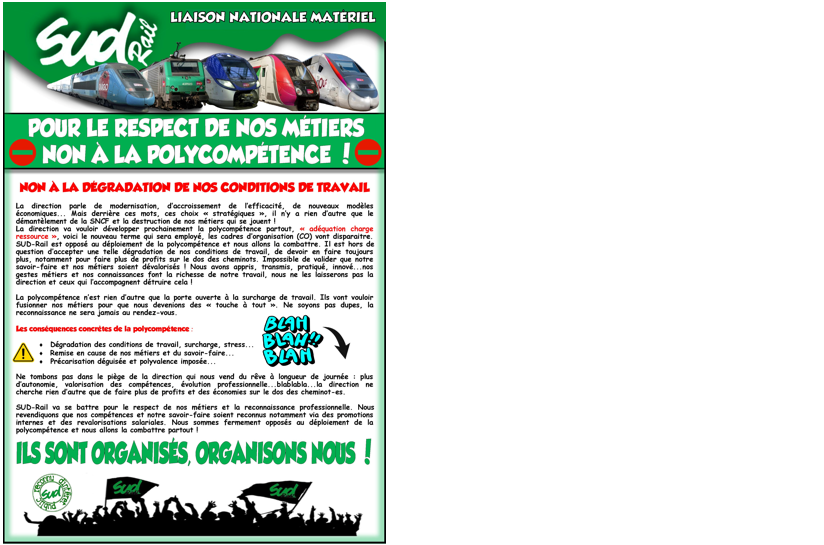 La direction va vouloir développer prochainement la polycompétence partout, « adéquation charge ressource », voici le nouveau terme qui sera employé, les cadres d’organisation (CO) vont disparaitre. SUD-Rail est opposé au déploiement de la polycompétence et nous allons la combattre. Il est hors de question d’accepter une telle dégradation de nos conditions de travail, de devoir en faire toujours plus, notamment pour faire plus de profits sur le dos des cheminots. Impossible de valider que notre savoir-faire et nos métiers soient dévalorisés ! Nous avons appris, transmis, pratiqué, innové...nos gestes métiers et nos connaissances font la richesse de notre travail, nous ne les laisserons pas la direction et ceux qui l’accompagnent détruire cela !