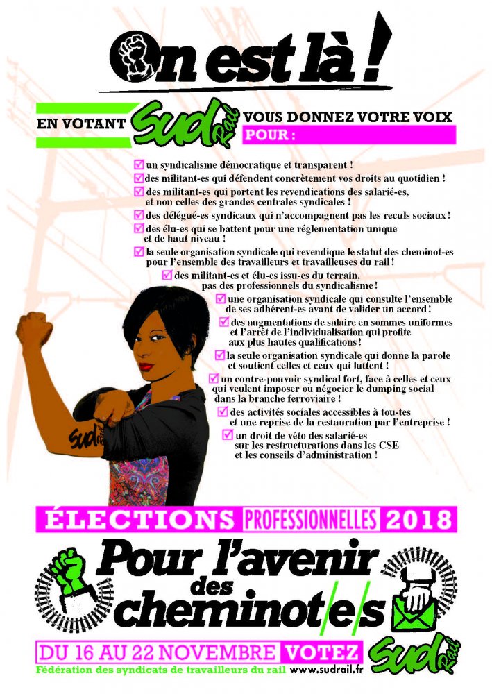Si vous refusez que vos conditions d’emploi, de salaire et de vie soient nivelées par le bas ; si vous n’êtes pas partisan-e de la mobilité imposée, du travail de nuit et de week-end forcé ; si vous n’acceptez pas la suppression de vos accords locaux… c’est bien le syndicalisme porté par vos élu-es SUD-Rail qu’il faut renforcer !