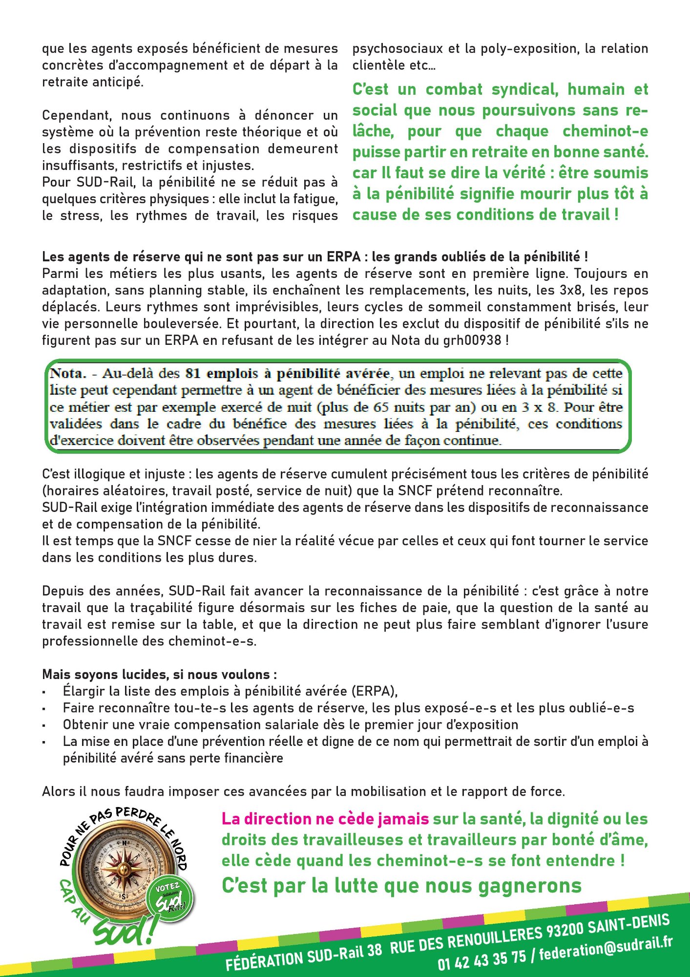 La pénibilité à la SNCF, est encadrée par le GRH00938, lui-même issu du dispositif « 2008 » propre à l’entreprise. Ce système, mis en place après la réforme des régimes spéciaux, définit la pénibilité comme l’exposition durable à un ou plusieurs facteurs de risques professionnels (contraintes physiques, horaires décalés, travail de nuit, environnement agressif, charge mentale, etc.) susceptibles de laisser des traces irréversibles sur la santé.