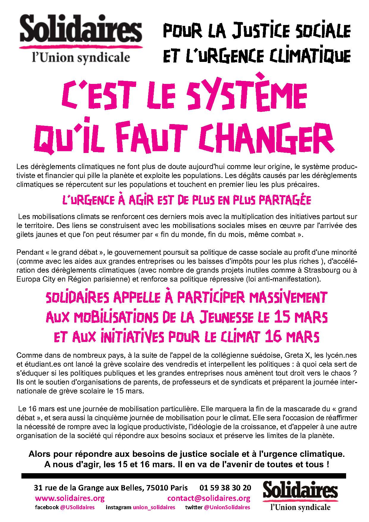 Le 16 mars est une journée de mobilisation particulière. Elle marquera la fin de la mascarade du « grand débat », et sera aussi la cinquième journée de mobilisation pour le climat. Elle sera l’occasion de réaffirmer la nécessité de rompre avec la logique productiviste, l’idéologie de la croissance, et d’appeler à une autre organisation de la société qui répondre aux besoins sociaux et préserve les limites de la planète.