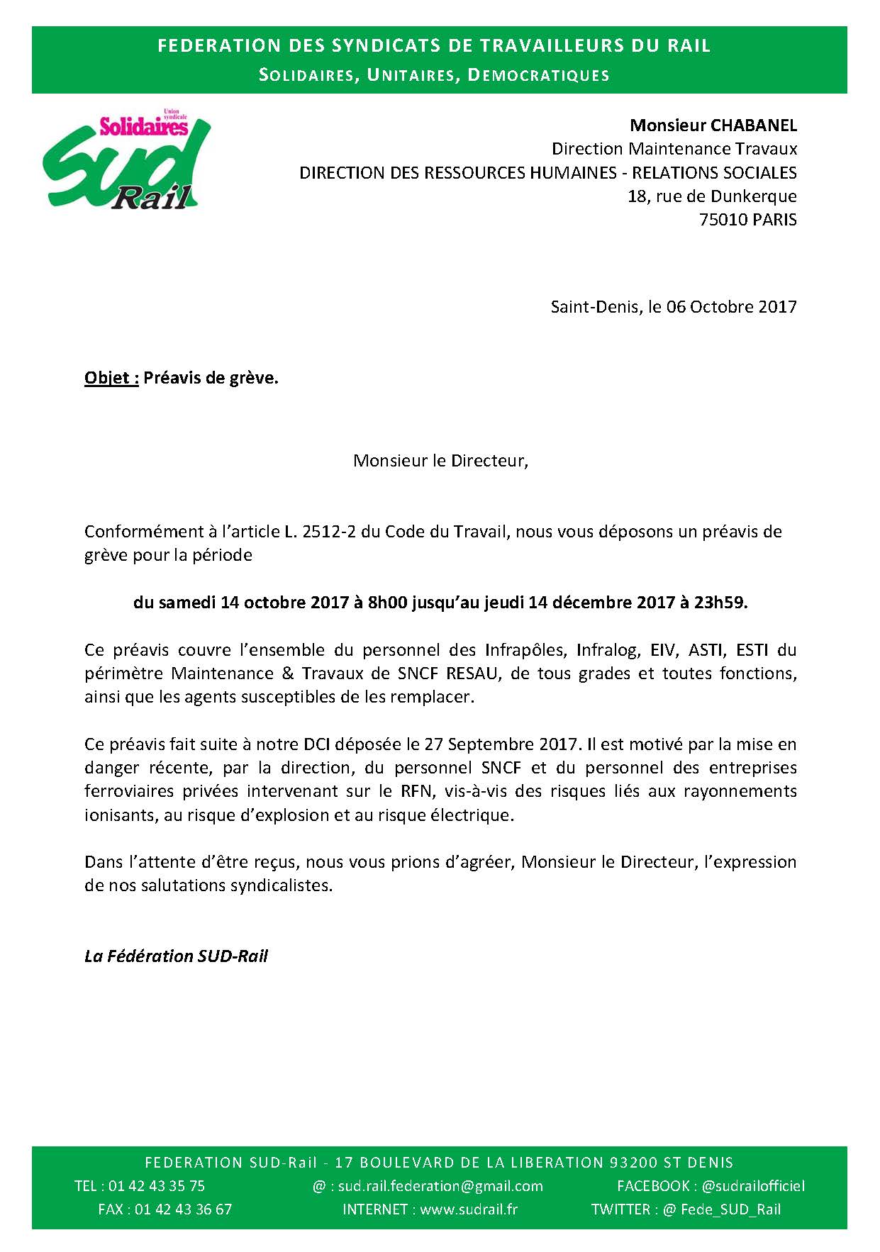 Ce préavis fait suite à notre DCI déposée le 27 Septembre 2017. Il est motivé par la mise en danger récente, par la direction, du personnel SNCF et du personnel des entreprises ferroviaires privées intervenant sur le RFN, vis‐à‐vis des risques liés aux rayonnements ionisants, au risque d’explosion et au risque électrique.