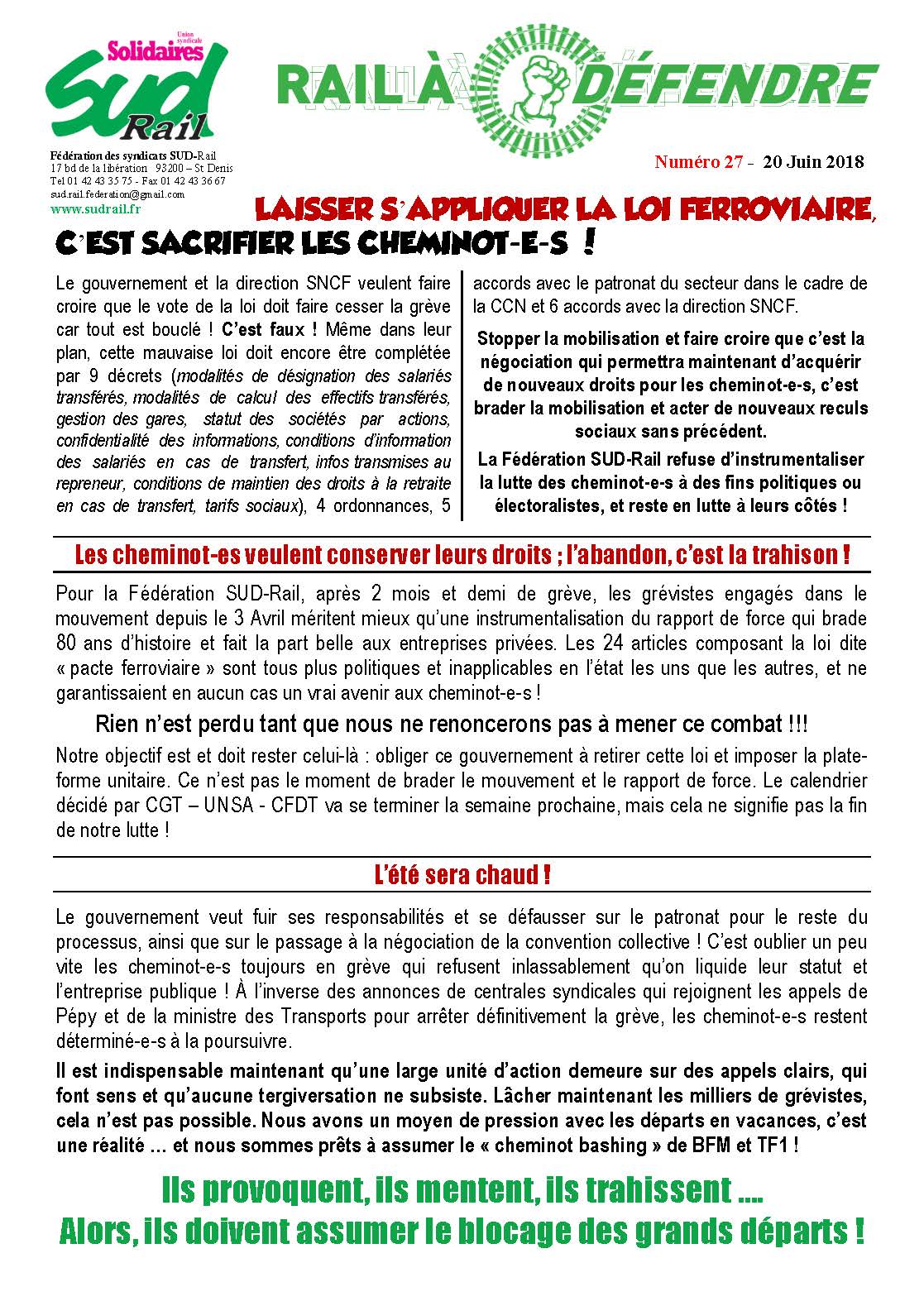 Pour la Fédération SUD-Rail, après 2 mois et demi de grève, les grévistes engagés dans le mouvement depuis le 3 Avril méritent mieux qu’une instrumentalisation du rapport de force qui brade 80 ans d’histoire et fait la part belle aux entreprises privées. Les 24 articles composant la loi dite « pacte ferroviaire » sont tous plus politiques et inapplicables en l’état les uns que les autres, et ne garantissaient en aucun cas un vrai avenir aux cheminot-e-s !
