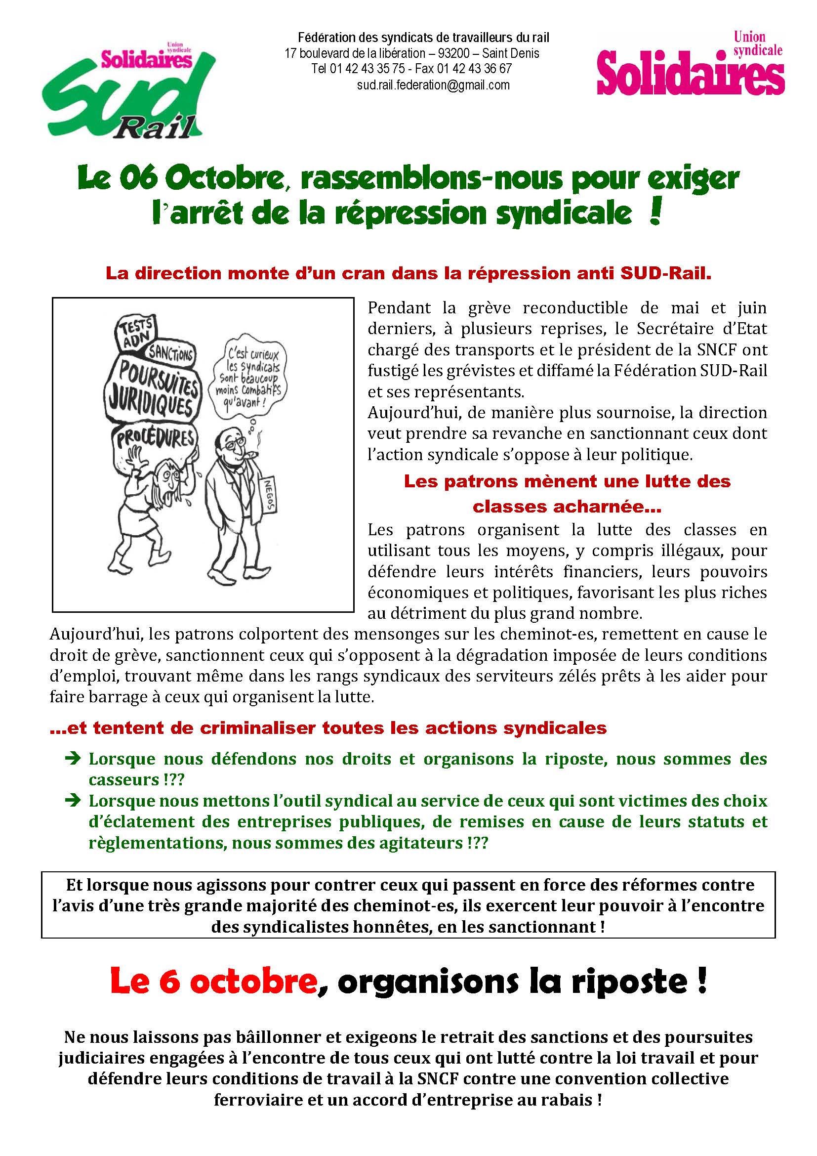 Pendant la grève reconductible de mai et juin derniers, à plusieurs reprises, le Secrétaire d’Etat chargé des transports et le président de la SNCF ont fustigé les grévistes et diffamé la Fédération SUD-Rail et ses représentants. Aujourd’hui, de manière plus sournoise, la direction veut prendre sa revanche en sanctionnant ceux dont l’action syndicale s’oppose à leur politique. Les patrons mènent une lutte des classes acharnée…