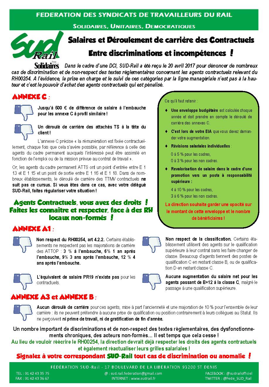 Dans le cadre d’une DCI, SUD-Rail a été reçu le 20 avril 2017 pour dénoncer de nombreux cas de discrimination et de non-respect des textes réglementaires concernant les agents contractuels relevant du RH00254. A l’évidence, la prise en charge et le suivi de ces catégories par la ligne managériale n’est pas à la hauteur et c’est le pouvoir d’achat des agents contractuels qui est pénalisé.