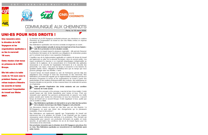 Elle fait suite à la table ronde du 10 mars avec le président Castex, qui refuse toujours d’étendre les accords et textes concernant l’organisation du travail aux filiales SNCF.